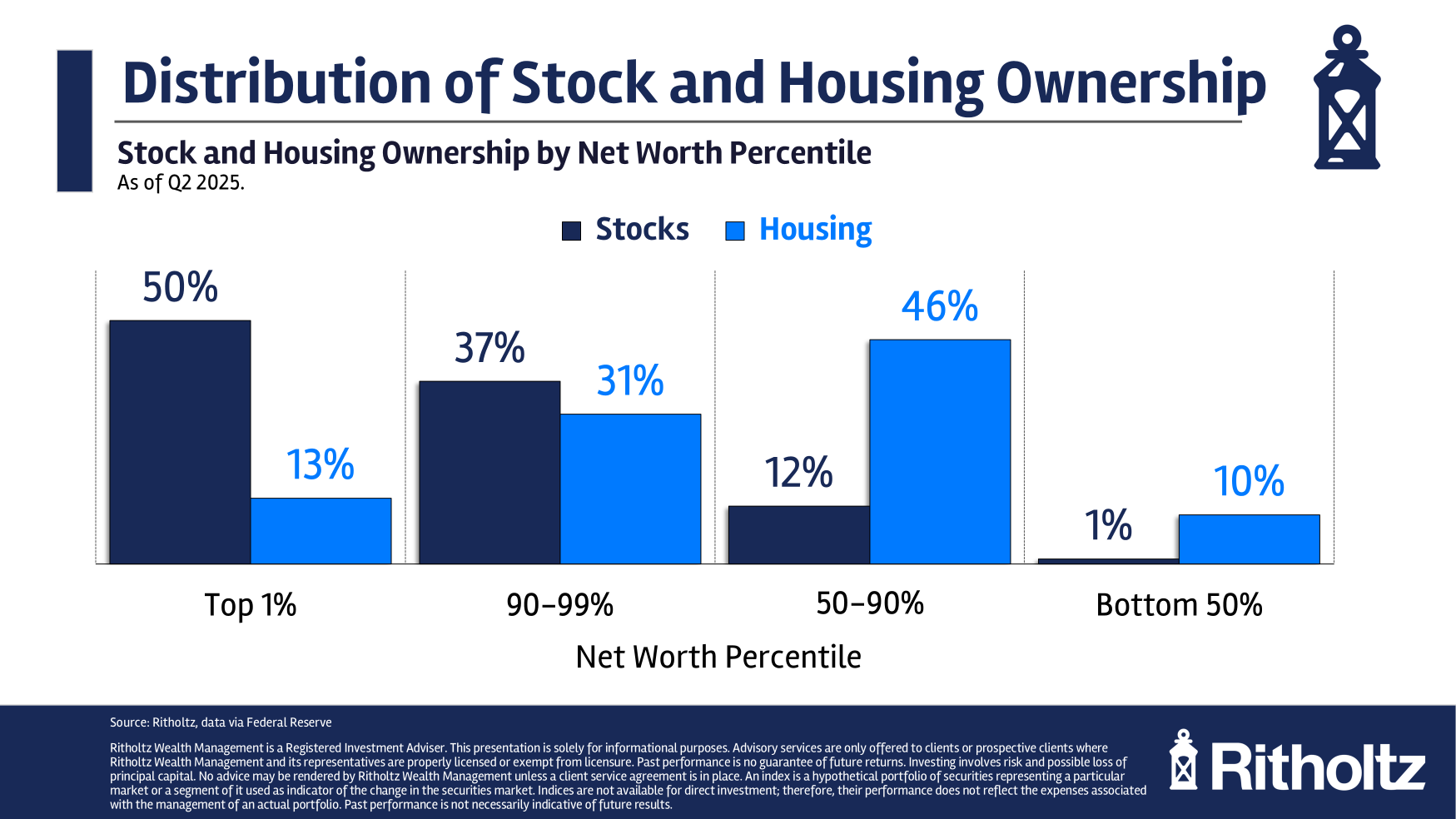 There IS a real wealth effect with housing – the bottom 90% own 87% of the houses – pretty close to what you expect. But even those numbers are skewed; the lower half of households – AKA renters – only own 10% of the housing stock. So even the wealth effect of housing is somewhat muted.