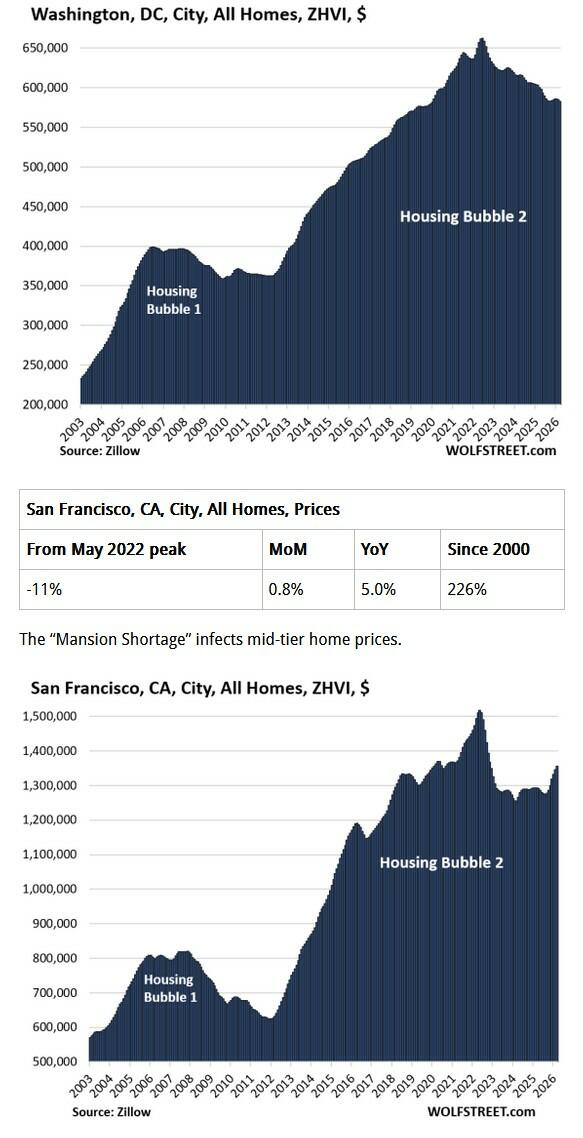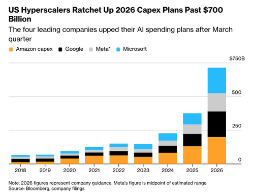 But none of that matters as long as capex recipients, i.e., chip and semi stocks, keep surging on hopes and expectations that the LLMs and hyperscalers will keep pumping them full of cash day after day, for the unforeseeable future, which they have so far: recall that at the end of Q4, full-year capex estimates soared to a mindblowing $740 billion among just 6 hyperscalers (a number which is expected to rise to almost $1 trillion in 2027).