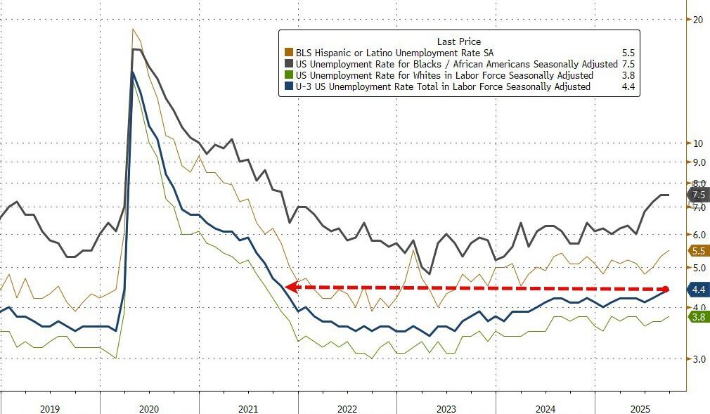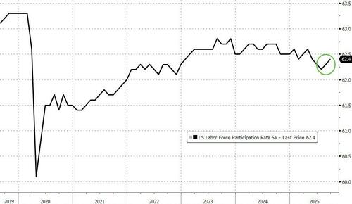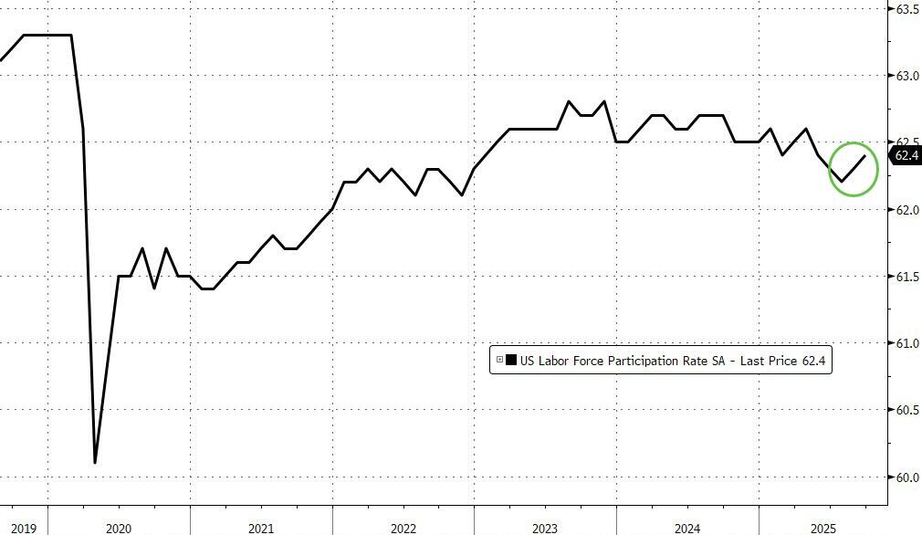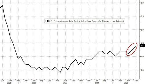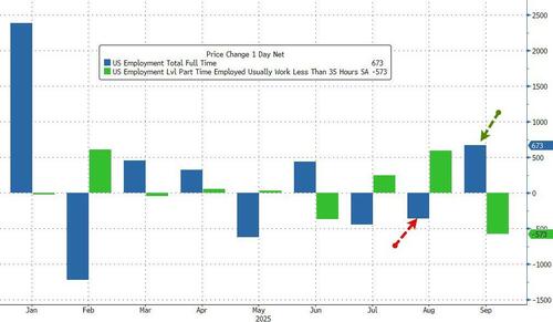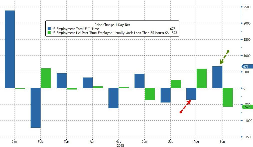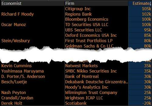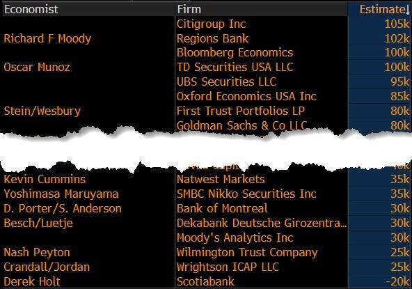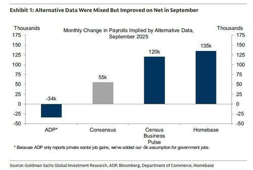 With the first of the week’s key events spurring a comeback for equities, attention is now turning to the path for interest rates as markets await the release of the September jobs report. The figures will be the only major labor market data published before the Federal Reserve’s next policy meeting. Forecasts are largely unchanged from those held before the original release date and may be stale. September payrolls are expected to rise by 51,000, up from Augustʼs 22,000, with a huge gap in estimates, ranging from a decline of 20,000 to a gain of 105,000 (Goldman is above consensus (80K), while JPM is just below the consensus print (50K) - our preview is here).