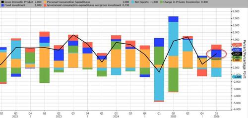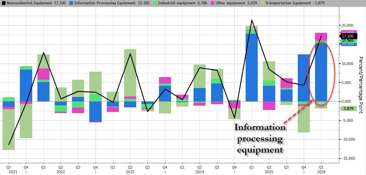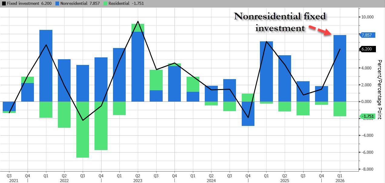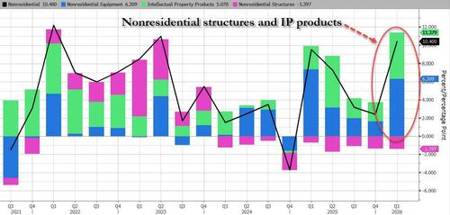Earlier today, when previewing this week's earnings by the Mag 7 which account for over $10 trillion in market cap set to report Q1 results after the close on Wednesday, Goldman's Delta-One head Rich Privorotsky said that "Equities are being driven by one thing…AI spend", and warned that "it's hard not to respect the strength of the AI bid, but the velocity has been extreme. The upside surprise vs expectations has almost entirely come from AI spend…it’s the whole game."