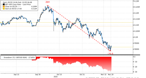 In commodities, spot gold falls $15 to around $4,063/oz. Oil prices extend gains after the Kremlin said they are not holding consultations with the US about ending the war in Ukraine. WTI January crude futures rise 0.8% to $59.75 a barrel. Bitcoin is up 1.5% near $92,000.