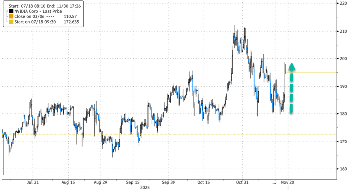 The AI euphoria, which defined markets for much of 2025 but went AWOL a month ago, is back if only for the time being as Nvidia’s blowout earnings and strong forecast, coupled with cautious positioning before the results, is spurring a relief rally. The results won’t erase all the concerns about AI circularity, but Jensen Huang’s view of the AI economy is taking precedence today. Focus later will turn back to macro data (or lack of it) and the Fed. Until then, US equity futures are sharply higher following the biggest wall of worry into year-end: as of 8:00am ET, S&P futures are up 1.3%, and Nasdaq futures surge 1.6%. If those gains hold, both gauges will move back above their key 50-day moving averages. In the premarket, NVDA (+5%) leading all stocks higher and Mag7, Semis, and AI Themes including recent laggards all rallying (ORCL +3%, CRWV +8%). Cyclicals are rallying ex-Materials and Defensives (ex-HC) poised to have a down day. Bond yields are mixed, from +1 to -1bp and the USD indicated a touch higher. Commodities are mixed with Ags rallying, WTI above $60, and Metals coming for sale. The macro data focus today is on the delayed release of the Sept payrolls (the only jobs data until the Dec 10 FOMC meeting), as well as new jobless data (our NFP preview is here). JPM's "TL/DR" is that the investment hypothesis remains intact and that a Fed cut is unnecessary to making new ATHs.