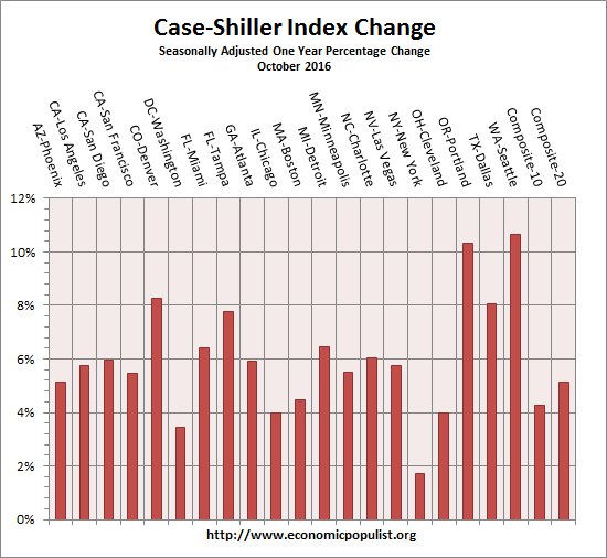 The October 2016 S&P Case Shiller home price index shows a seasonally adjusted 5.6% price increase from a year ago for the 20 metropolitan housing markets and a 4.3% yearly price increase in the top 10 housing markets. Last month the annual gain was 5.4%. Home prices are still climbing over double the rate of inflation and are back up to 2007 housing bubble price levels. The U.S. National Home Price Index has also increased 5.6% from a year ago and has hit an all time high. This index covers all nine U.S. Census geographical divisions. Since the price low of March 2012, the 10-City composite index has increased 40.4% and the 20-City composite index has increased 43.1% and prices are back to winter 2007 levels. Affordability is gone with measures showing 20-30% declines since 2012.