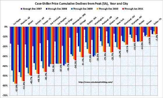The graph below, from Calculated Risk, shows how much prices have fallen from their peaks in the Composite-10 cities. Calculated Risk has additional custom graphs and data analysis and is the uber site for residential housing data and graphs.