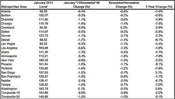 You know an economic report is bleak when the title contains dismal start. Such is the S&P/Case-Shiller Home Price indexes report for January 2011. The composite indexes hit new lows, with the home prices of the 20 cities composite index being down -3.1% and the composite-10 dropping -2.0% in comparison to January 2010. Literally, in the report, we have this: