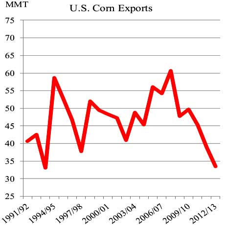 In July 2012, corn exports according to Grain Inspections reached only 2.3 million tons, down more than 40 percent from a year ago.