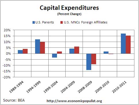 Apologists will argue that U.S. multinationals are simply hiring where their sales are and abroad is where expansion is happening.  They point to the percentage change in sales made abroad vs. in the United States as shown in the below graph.  In 2011 sales in foreign lands increased 15.8% whereas U.S.sales increased 9.4%.