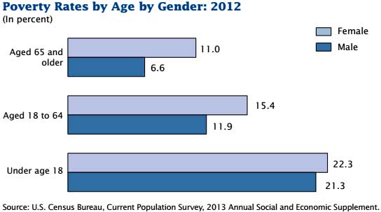 No surprise with that level of income inequality between the sexes, women dominate the poverty rolls. Overall 16.3% of females are in poverty in comparison to 13.6% of males. Women over the age of 65 have a poverty rate almost double their male counterparts, 11.0% to 6.6% for older men. In 2012 a whopping 30.9% of women with families lived in poverty and their kids represent 47.2% of all children growing up in poverty stricken conditions. Compare that statistic to male householders with families. Their poverty rate is 16.4%.