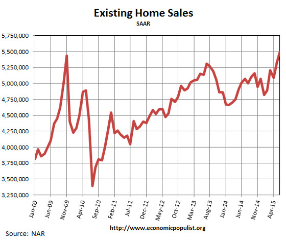 NAR's existing home sales really shot up in June with a 3.2% sales increase to 5.49 million annualized existing home sales. This is an eight and a half year high. In February 2007 existing home sales were 5.79 million. This makes sales 9.6% higher than June of last year. Existing home sales have been above their year previous amounts for six months now. Prices are clearly in unaffordable territory as the median home price just surpassed the housing bubble July 2006 peak and hit a new record.