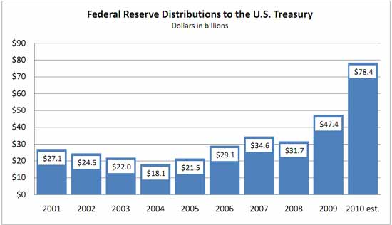 The Federal Reserve Board on Monday announced preliminary unaudited results indicating that the Reserve Banks provided for payments of approximately $78.4 billion of their estimated 2010 net income of $80.9 billion to the U.S. Treasury. This represents a $31.0 billion increase in payments to the U.S. Treasury over 2009 ($47.4 billion of $53.4 billion of net income). The increase was due primarily to increased interest income earned on securities holdings during 2010.