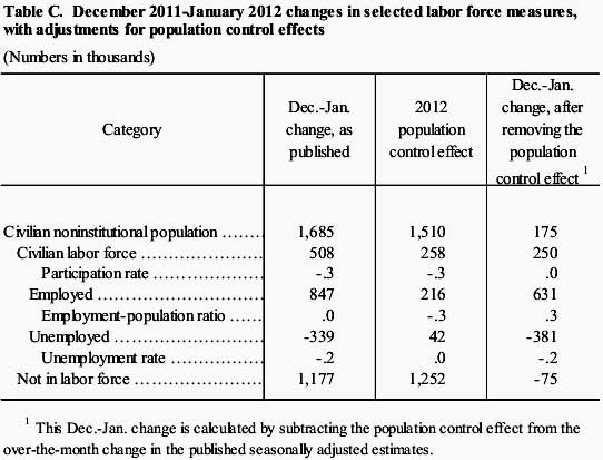 The above is my favorite yearly confusing table from the BLS. This table gives you what the monthly comparisons would be from December to January without the population adjustments. Few read it. Fewer still understand it. Column 1 of table C. is what is reported to you in the press. Column 2 are the population adjustments, put into the January data. The 2012 population controls effect of column 2 is that one lump dump of monthly data which represents a year's worth of adjustments. This time the second column also represents the 2010 Census data incorporated. Ok, now, the last column, column 3. That tells you what the monthly change would be if there were no population adjustments or the 2010 Census was not incorporated into the January numbers.