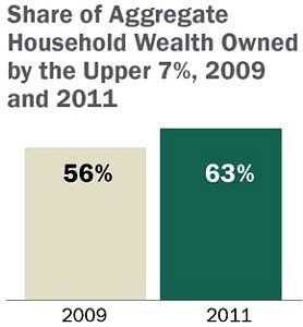 During the first two years of the nation’s economic recovery, the mean net worth of households in the upper 7% of the wealth distribution rose by an estimated 28%, while the mean net worth of households in the lower 93% dropped by 4%.