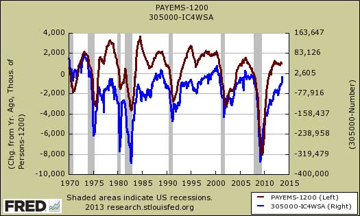 The DOL reported people filing for initial unemployment insurance benefits in the week ending on September 28th, 2013 was 308,000, a 1,000 increase from the previous week of 307,000. Since the monthly unemployment report will not be released due to the shutdown, we show below the correlation of initial unemployment claims to payroll growth.