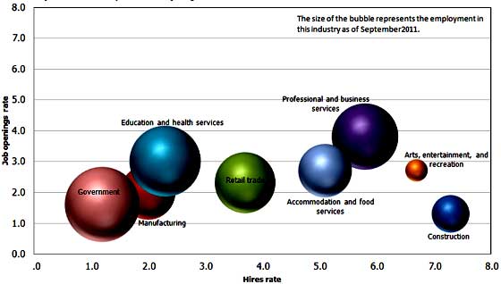 For the JOLTS report, the BLS creates some fairly useful graphs, some of which were reprinted here, and they have oodles of additional information in their databases, broken down by occupational area. The Saint Louis Federal Reserve also had loads of graphing tools for JOLTS. Below is a reprint of the BLS bubble graph, and the first thing to note is how health and educational employment dwarfs manufacturing. For economies of scale, we really need to see that manufacturing bubble grow and grow, it's about 11% of the total economy which is not good for a host of reasons.