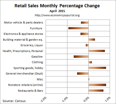 April Retail Sales has assuredly disappointed Wall Street and is just one report in a series indicating the U.S. economy has gone into standby mode.  Retail sales had no growth and even excluding gasoline sales only grew 0.1%.  Autos & parts dropped -0.4% for the month.  Without autos & parts sales, April retail sales increased 0.1%.  Gasoline sales declined by -0.7%.  Sporting goods & hobby stores showed a 0.8% increase but department stories sales declined by -2.2%.  Retail sales have now increased only 0.9% from a year ago and that's really not great.  Worse, all of 2014 retail sales were revised downward by -1.2% than previously reported.   Retail sales are reported by dollars, not by volume with price changes removed.  Retail trade sales are retail sales minus food and beverage services and these sales were down -0.1% for the month.  Retail trade sales includes gasoline.