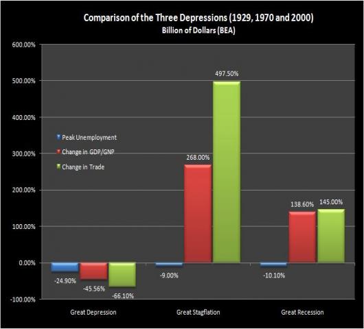 Be that as it may, the Great Stagflation presents a bit of a problem: Although gold tells us it occurred, Gross Domestic Product, as measured by dollars, actually ended higher than it began in the 1970s contraction. Peak unemployment, though higher also, was nowhere near the peak of the Great Depression. U.S. trade volume positively exploded, whereas it viciously contracted during the Great Depression. Here is a comparison between these two depressions, with the current Great Recession thrown in for good measure.