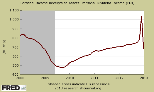Personal receipts, income on assets, plunged by –17.8%.  This is income from non-incorporated businesses, such as the self-employed.  Dividend income, part of income on assets cliff dove –34.8% for the month, interest income, –0.3%.   The plunge in assets is due to accelerated reporting and changes in the tax rates.  In other words, the fiscal cliff deal to raise income taxes is what affected these monthly percentage changes.  From the BEA: