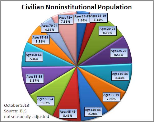 Below is a pie chart showing the breakdown of the civilian noninstitutional population by age for October 2013 and this is not seasonally adjusted.  We're going to use this breakdown of the population by age to prove again that the dropping labor participation rate is not due to retirement or more young people going to school as this myth, which is continually perpetuated without fact or figures, needs to be dispelled.