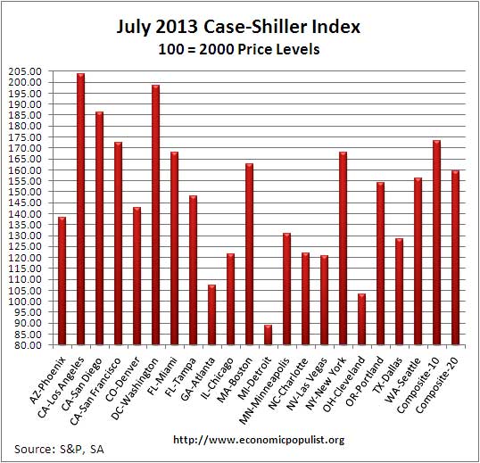 Below are the seasonally adjusted indices for this month. The index itself tells you what has happened to home prices, per city, from the year 2000. Only Detroit is below their 2000 home price values with Cleveland just barely at 2000 price levels. Then look at LA, a city rife with poverty. Home prices have doubled since 2000. Clearly LA represents a land of the privileged few and the rest.