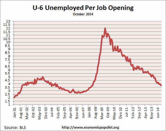 The BLS JOLTS report, or Job Openings and Labor Turnover Survey shows there are 1.9 official unemployed per job opening for October 2014. Job openings were around 4.8 million. Job openings returned to pre-recession levels while hires has increased 33% since June 2009. In just the private sector job openings have also recovered to precession levels while private hires have increased 40% from their 2009 lows.